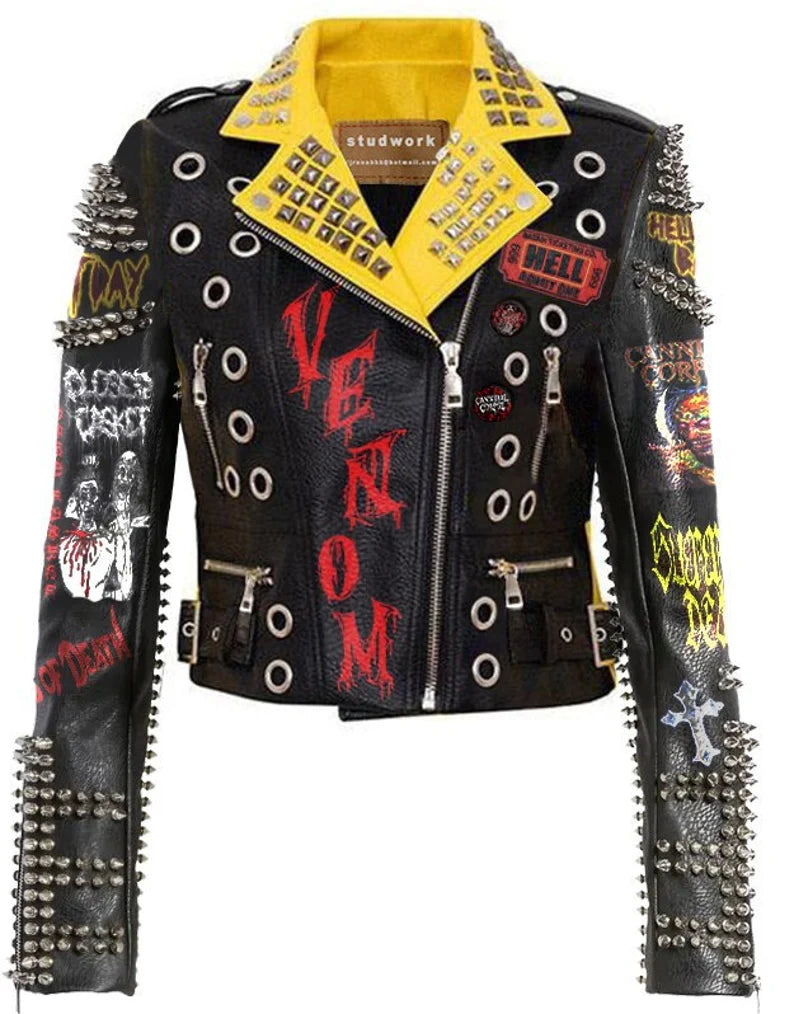 Biker's Silver Spiked Studded, Women's Club Wear Gothic Jacket, Cannibal Corpse Handmade Leather Outfit, Tombstone Patches Brando Jacket,