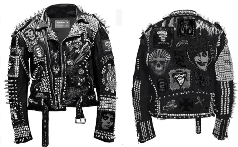 Jacket flaunts multiple patches and badges like Misfits, Sex Pistols, Deadly Mosh, Frankenstein, and more, exuding a rich fashion vibe.