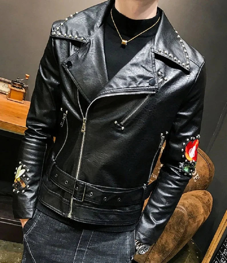 Brando Style Patches Leather Jacket Men, Black Fashion Outer Wear Studded, Sakata Butterfly Patch, Customize Biker's Punk Jacket,
