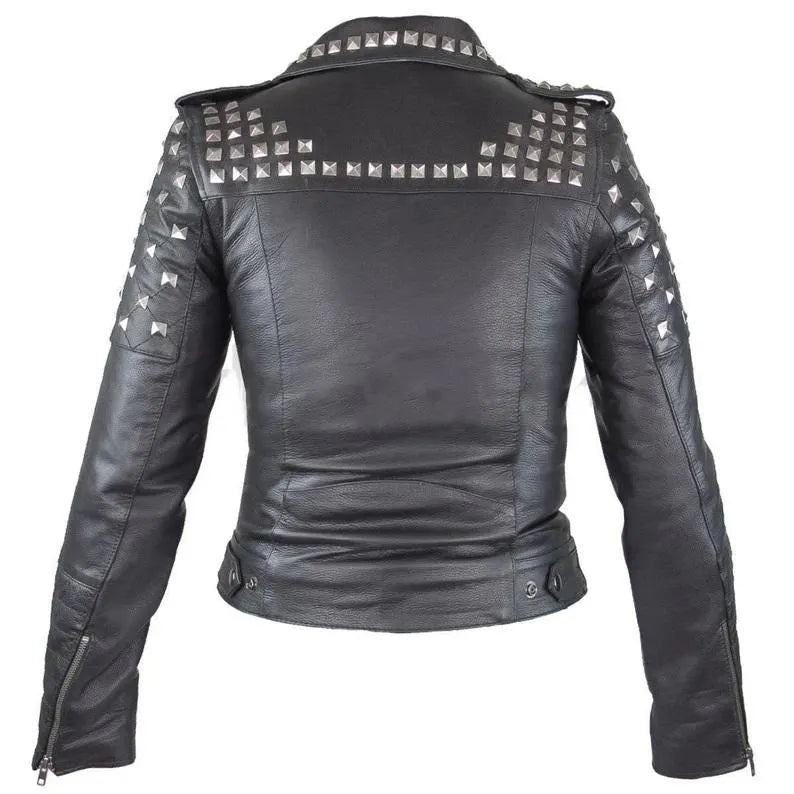 Adorned with silver pyramid studs, adding a rebellious, high-impact edge