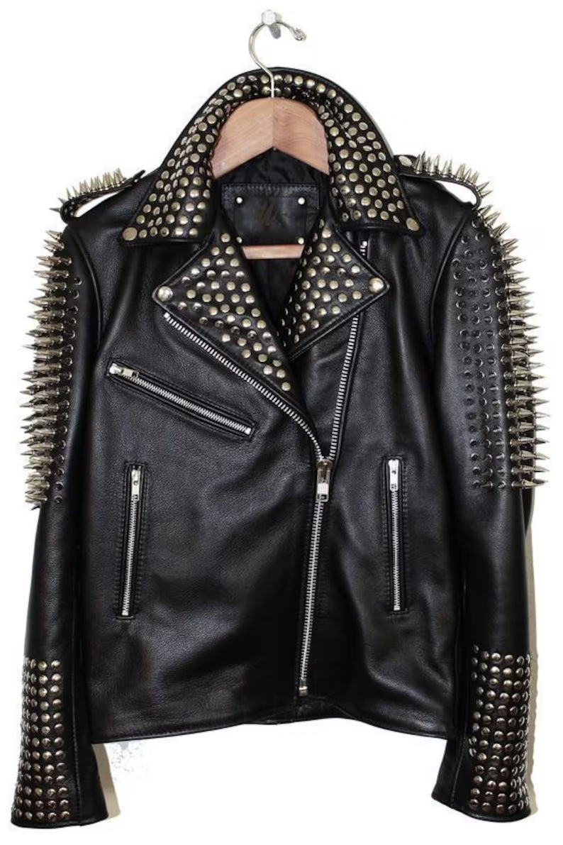 Silver spikes embellishing the upper sleeves, running from elbow to shoulder for a fierce look
