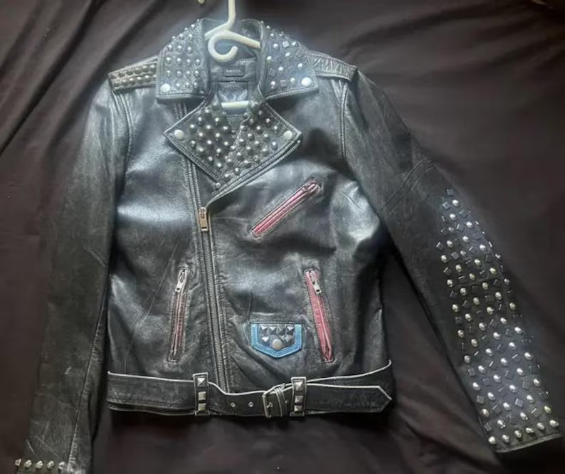 Lapel collar adorned with silver round & pyramid studs, creating a sharp, rebellious look