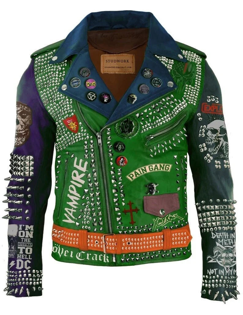 Adorned with various studs, including spikes, pyramid studs, cone studs, round studs, and conical studs, creating a heavily detailed, layered texture