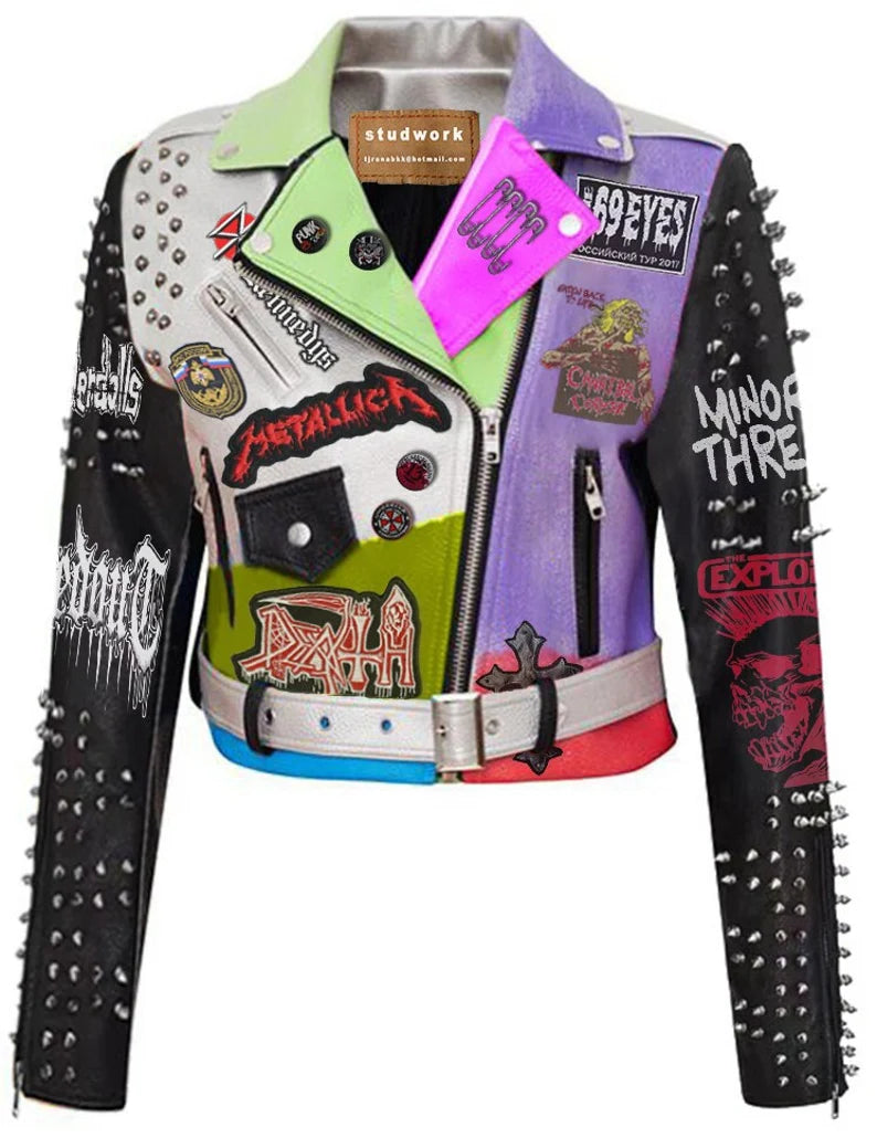 This cropped, moto-fit jacket is made from premium 0.9–1.0 mm cowhide leather, designed for bold women who live unapologetically. Featuring a vibrant multicolor patchwork of iconic bands like Metallica, Cannibal Corpse, The Exploited, Minor Threat, and more, each patch is carefully stitched to create a one-of-a-kind statement piece.