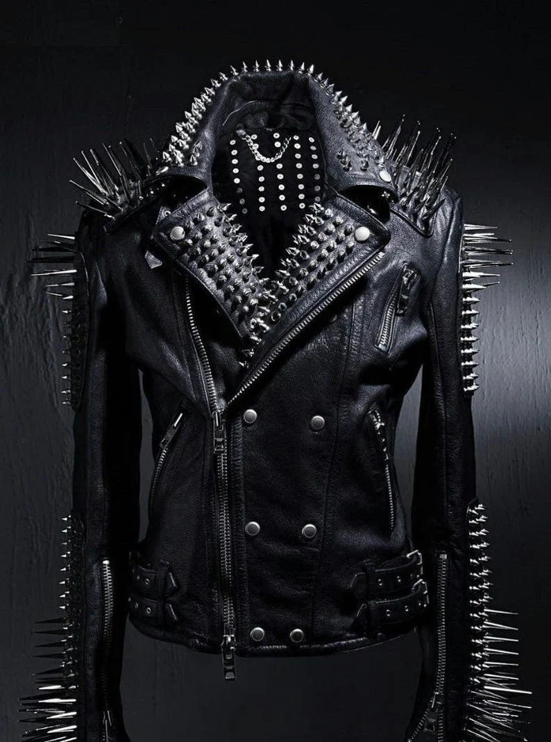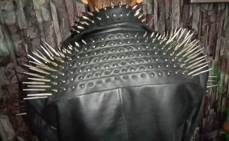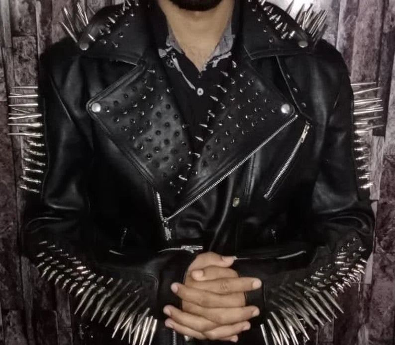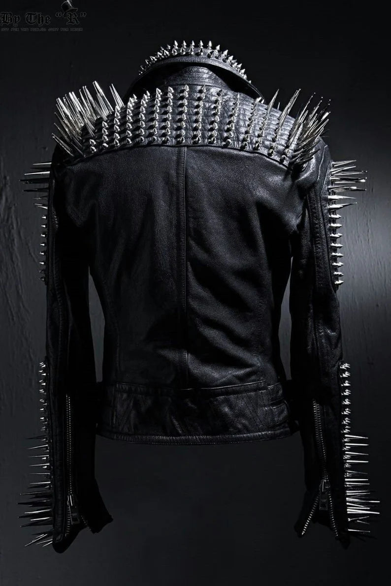 HANDMADE Mens Full Black Punk Silver Long Spiked Studded Leather Buttons Up Jacket Silver Studs and Spikes Black Leather Made to Orders