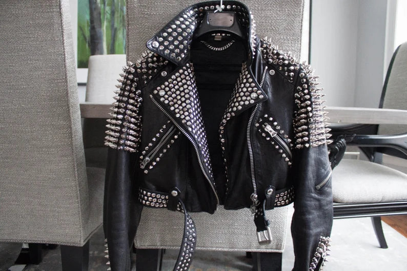 Hippie Spiked Leather Jacket Women Handmade Rocker Punk Clothing Silver Long Spiked Studded Leather Buttons Steampunk Clothing