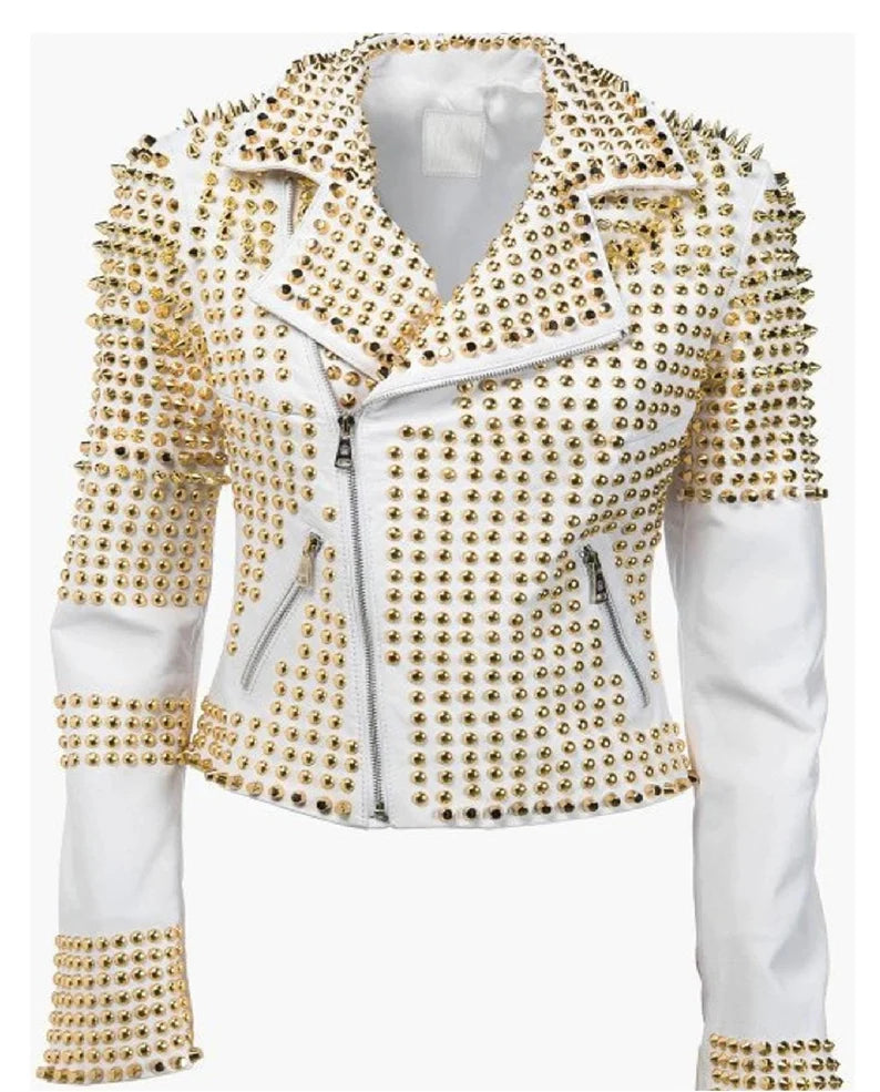 Man white leather jacket with high quality gold studs. Extremely punk and hip, this amazing jacket will rock your way!