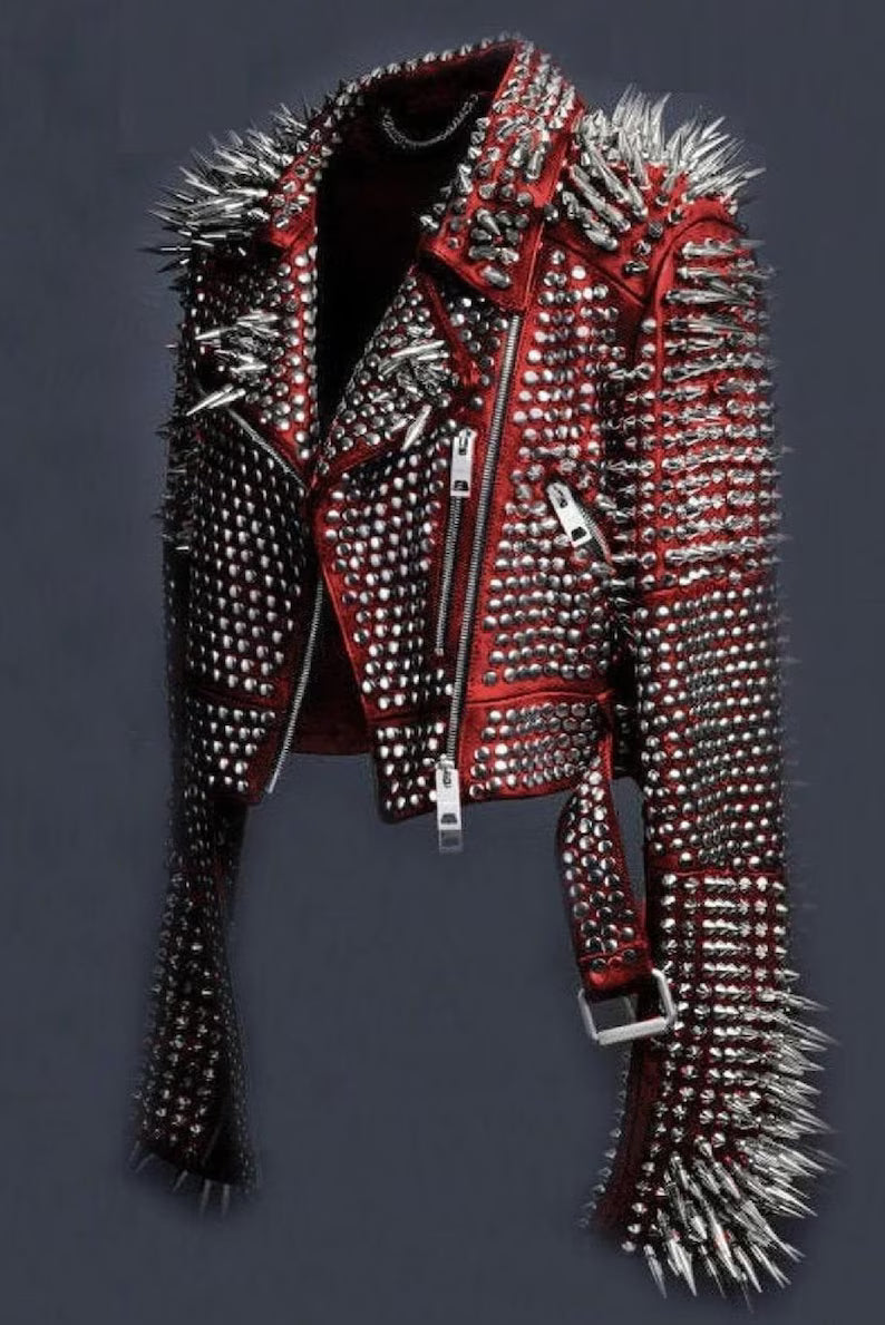 Maroon Red Full Punk Silver Long Spiked Studded Leather Brando Jacket, Tribal Rock Punk Gothic, Rockers Clothing, Steam Punk Clothing Jacket