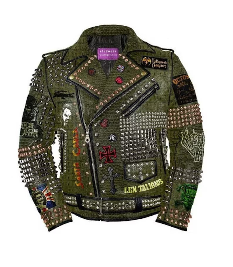 Jacket showcases a mix of patches and badges, featuring icons like the Halloween Vampire and Santa Carla, adding a unique, eclectic charm to its style