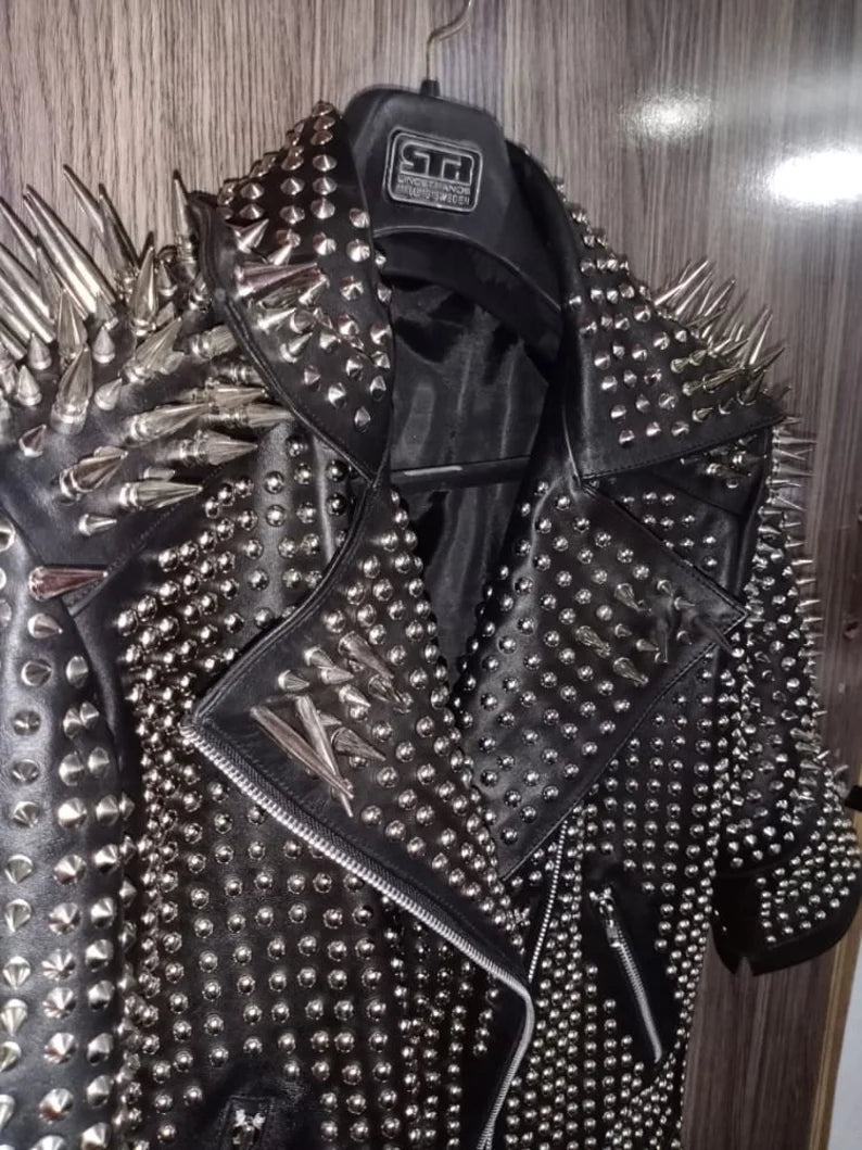 Made from 0.9–1.0 mm genuine cowhide leather, this cropped Brando-style jacket in jet black features an audacious arrangement of long spikes, multi-stud detailing, and silver hardware. Every stud and pin badge is securely hand-applied, transforming this piece into a bold declaration of style and rebellion.