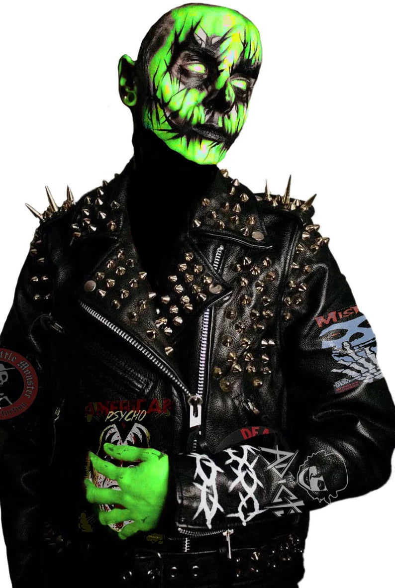 Made from 0.9–1.0 mm genuine cowhide leather, this cropped moto-fit jacket features iconic patches like Dead Kennedys, Misfits, Social Distortion, and The Adicts, each stitched to amplify your presence. With hand-applied spikes, studs, and pin badges, this piece is built for those who wear rebellion like a second skin.