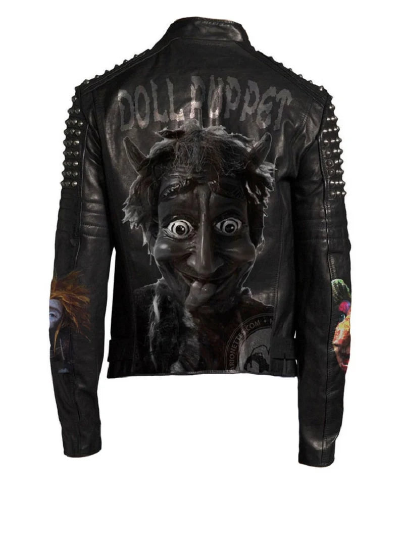 Made from 0.9–1.0 mm genuine cowhide leather, this slim-fit moto jacket features bold silver round studs, buckled waist belts, and a striking Doll Puppet patch that adds eerie elegance. With hand-applied pin badges and a cropped silhouette, this piece is built for those who wear defiance like a second skin.