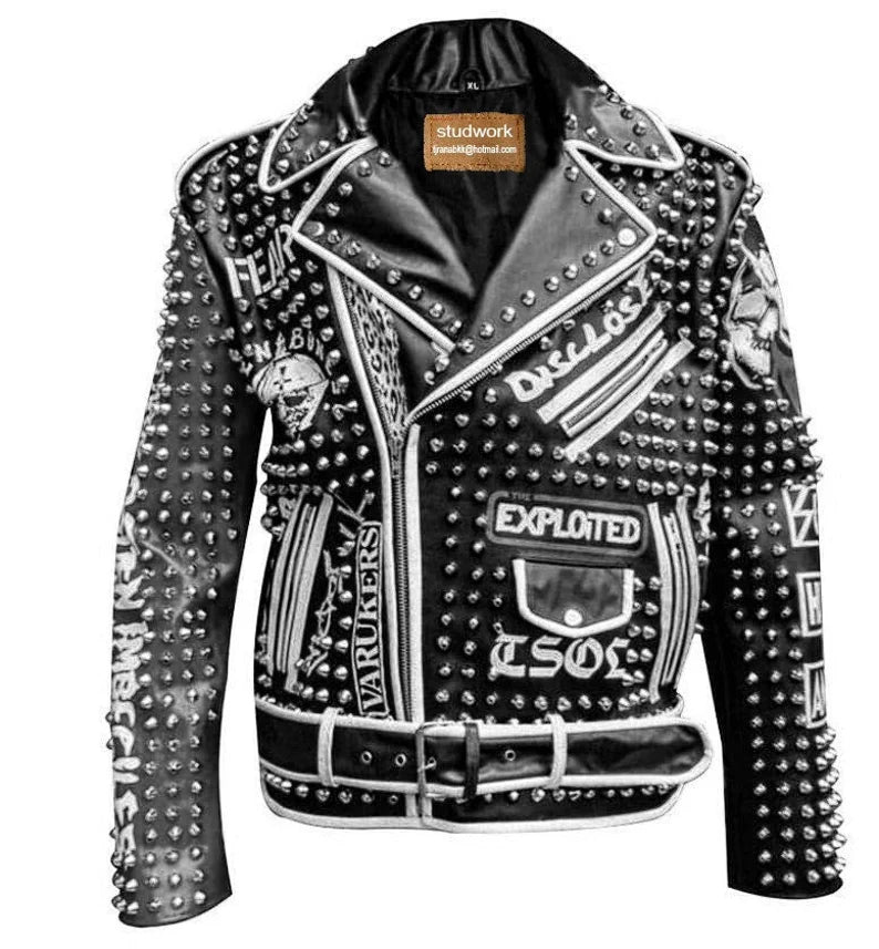 Men Studwork Patch Leather Outfit, Gothic Fashion Patchwork Jacket, Conical Studded Exploited, Personalized Jacket, Biker Leather Men Wear,