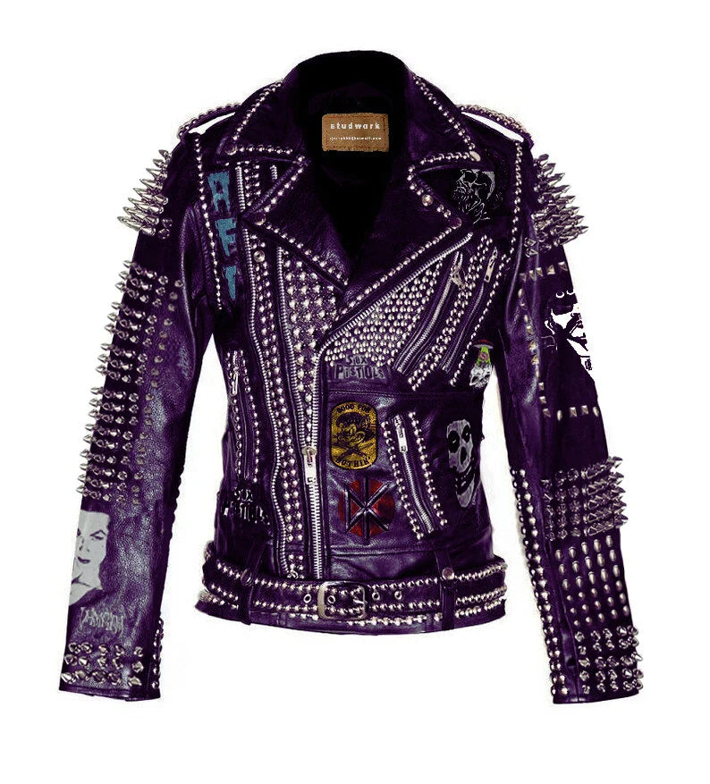 Make a bold entrance with this purple leather punk jacket, where gothic elegance meets heavy metal attitude.