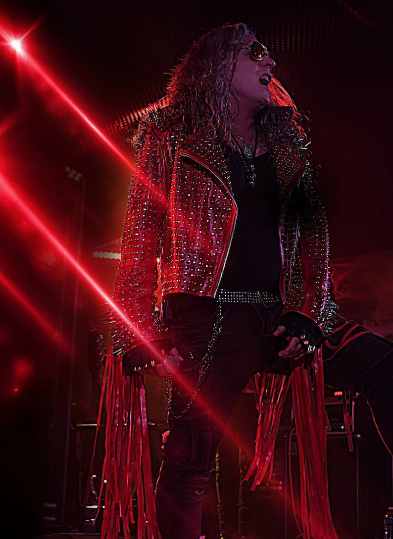 Red Rocker Studded Jacket Leather, Silver Studded Red Leather Jacket Premium Quality, Star Singer Performed on stage, Pop Lead Singer