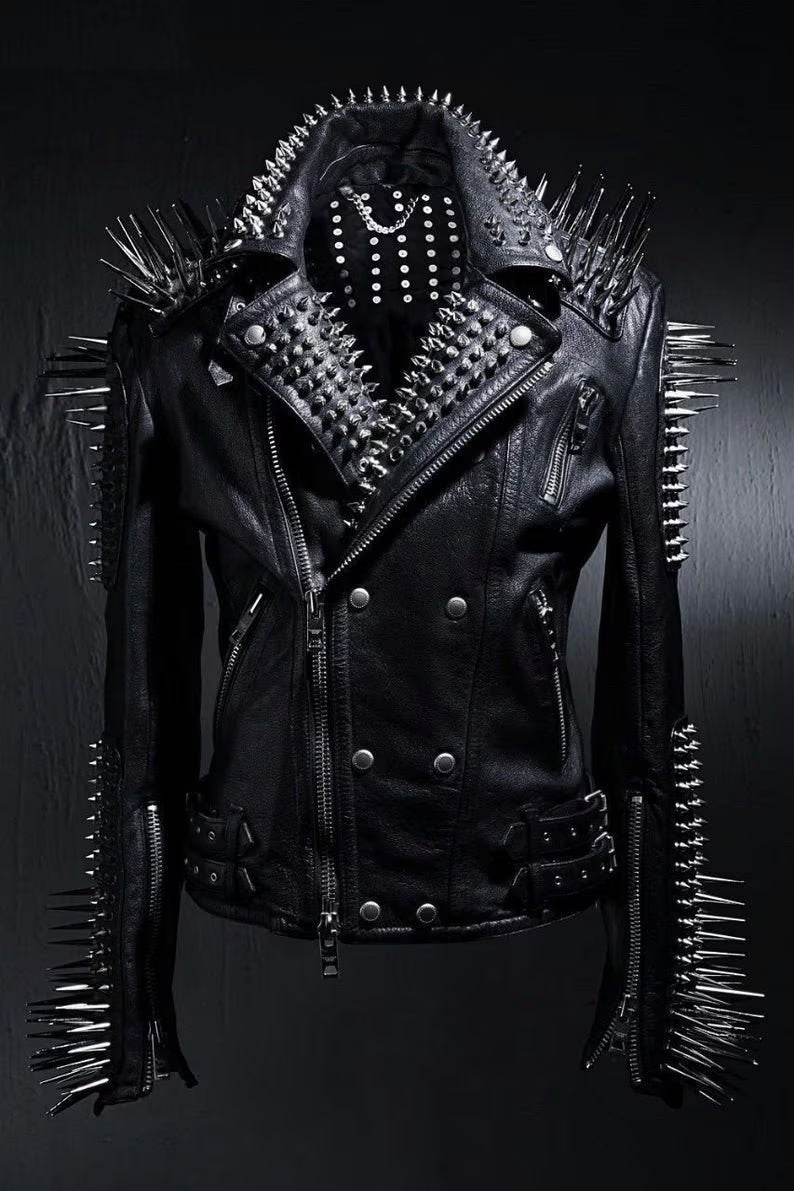 Studded Leather Jacket Women Handmade Full Black Punk Silver Long Spiked Studded Leather Buttons Up Jacket Silver Studs and Spikes Black Leather Made to Orders Steampunk
