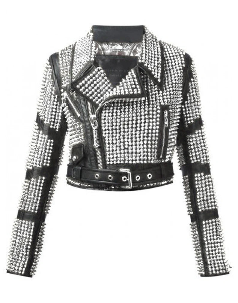 STUDWORK Handmade Woman Silver Studded Leather Jacket, Leather Steam Punk Silver Studs Biker Cowhide Leather Jacket SpikesandStuds Belted Leather Jacket Size