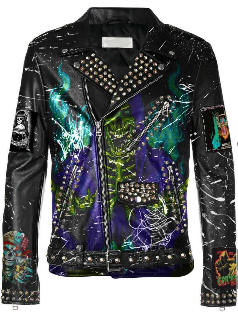 The jacket also showcases Hiatus Kaiyote, adding a touch of experimental soul and jazz fusion, alongside The Cramps, representing raw rockabilly punk energy. Skull amplifies the rebellious aesthetic with its bold imagery, while Grim Reaper brings a dark, haunting presence. Reinforced with steampunk studs, intricate metal work, and pin button badges, this jacket blends underground edge with industrial detailing.