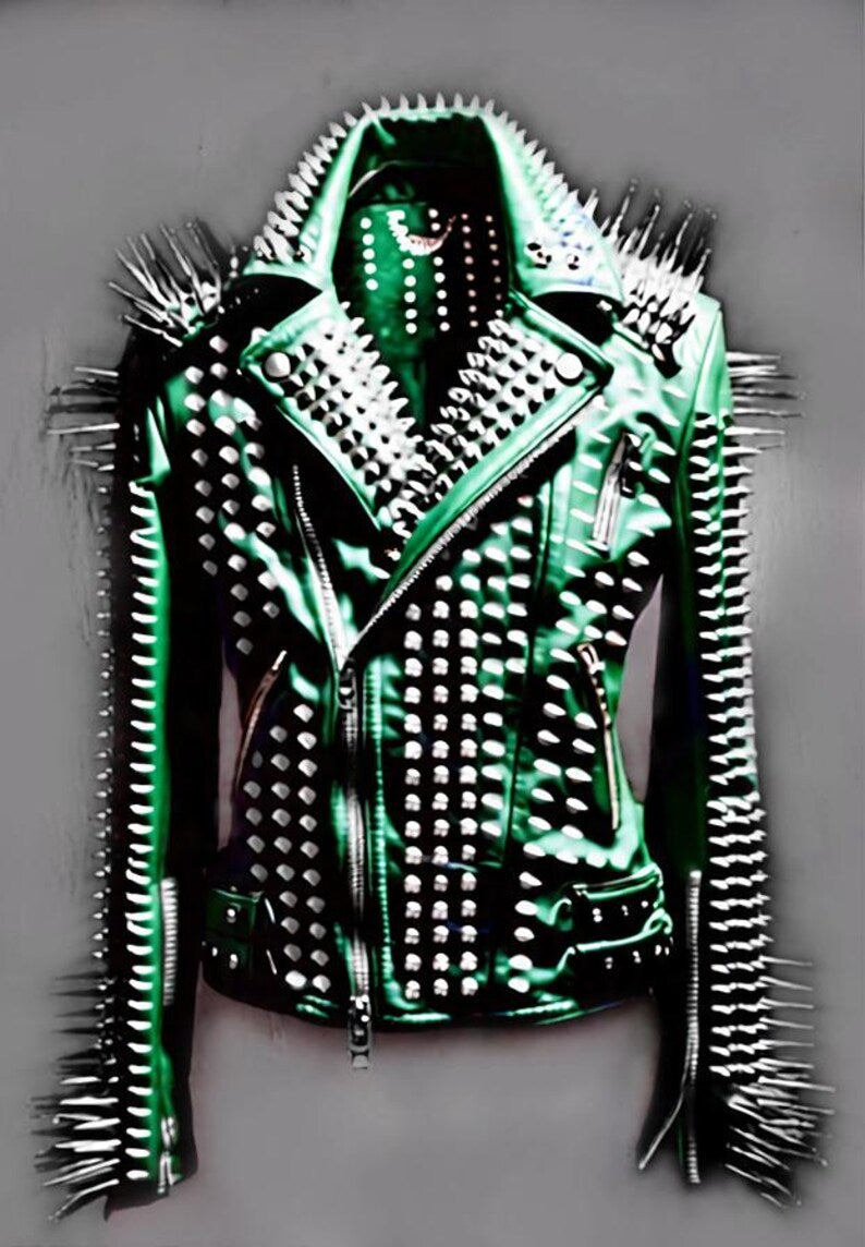 Where chaos meets couture — this venom-green leather biker jacket fuses steampunk machinery with gothic street rebellion. Fully loaded for fearless nights out, it slashes the silence with its emerald intensity and riot-ready silhouette.