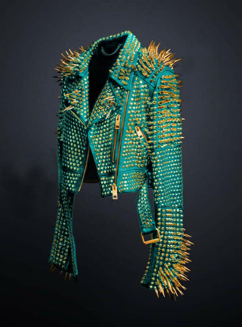 Crafted from 0.9–1.0 mm genuine leather, it features a powerful Brando-style moto silhouette with a lapel collar, rugged waist belt, and jaw-dropping golden spikes and studs arranged with gothic precision. Each metal accent is hand-applied, built to reflect the customer's individuality—whether styled for motorbike grit, punk rock swagger, or underground partywear. And yes, it's fully customizable, for men or women, in any size or color you crave.