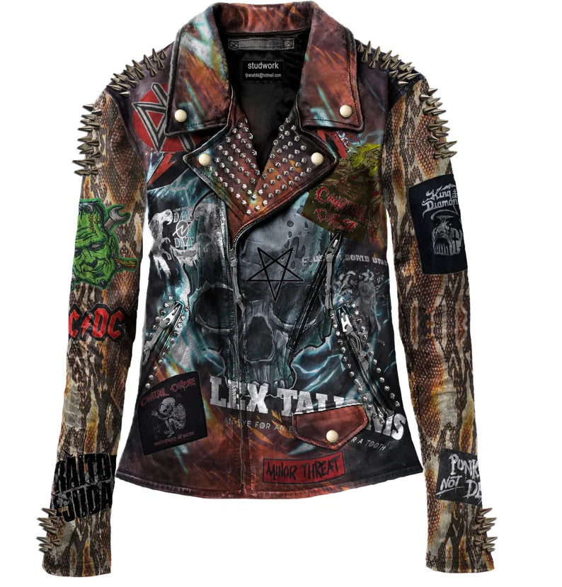 Strike like venom with this handcrafted gothic leather jacket—where snake prints meet bullet spikes in a fusion of danger and defiance.