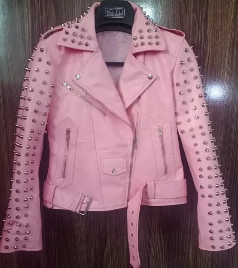 Make a bold statement with this handcrafted women’s leather jacket—where conical studs and Brando attitude collide in fierce biker fashion.