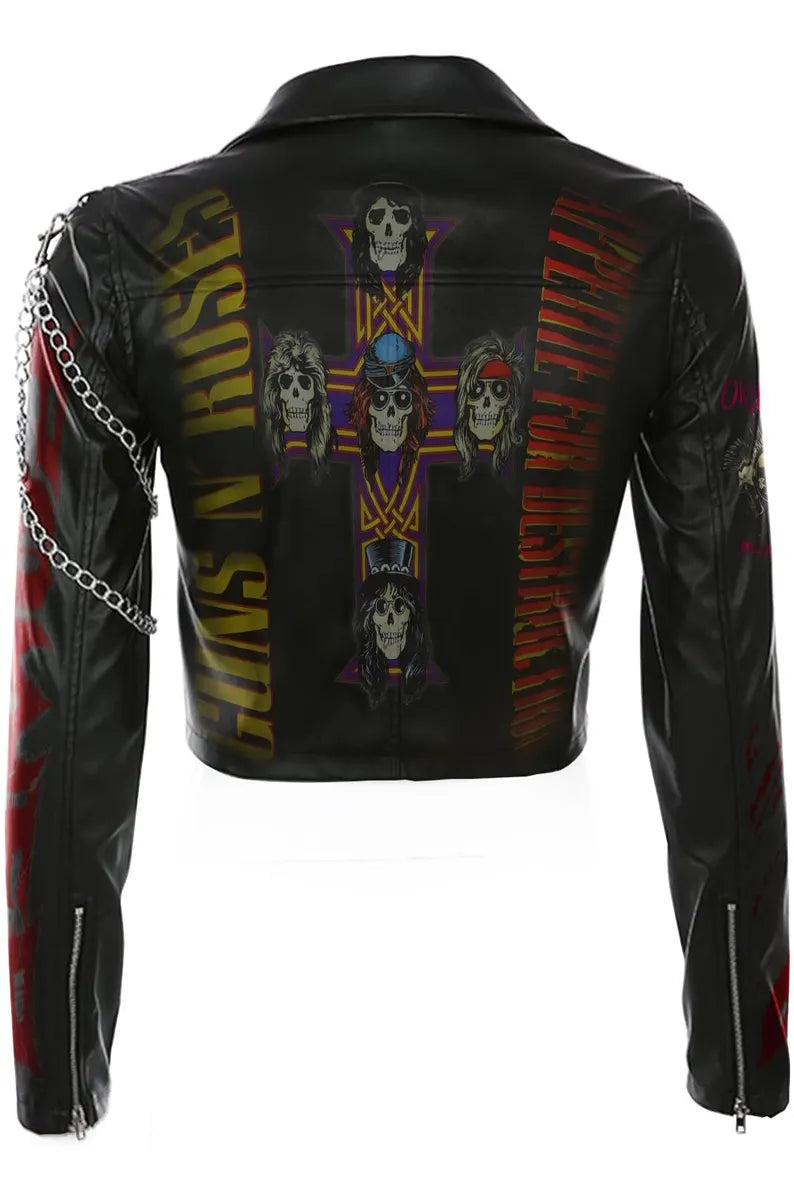 The jacket’s bold Brando-style silhouette comes alive with a full-back Guns N’ Roses patch, while sleeves flaunt matching patches—including a standout silver metal chain on the left sleeve for raw punk edge. The front pops with pin button badges, additional Guns N’ Roses artwork, and classic flap pockets, all stitched into an iconic cut.