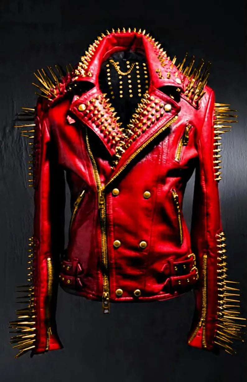 Turn heads and own every room with this bold red leather biker jacket, featuring striking gold cone spikes and studs. A true statement piece, this handcrafted jacket blends punk rock rebellion, heavy metal edge, and gothic stagewear aesthetics – perfect for rockstars, bikers, performers, or anyone who dares to be different.