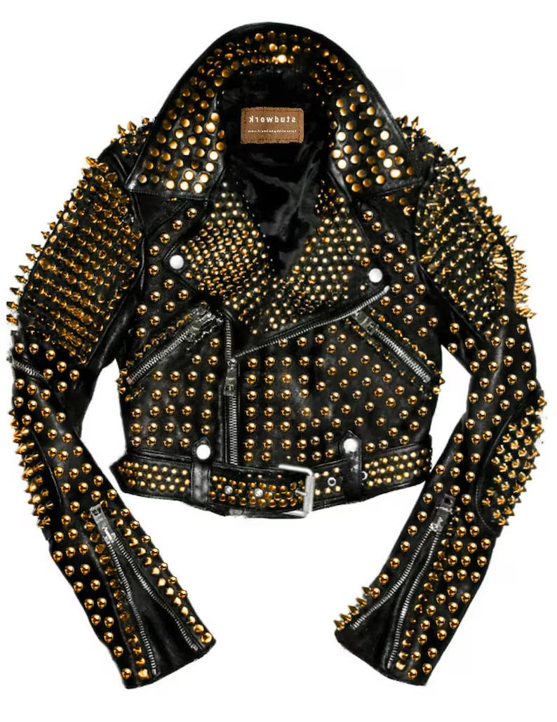This bold Women's Silver Belted Brando Biker Jacket is a statement piece, crafted from premium leather and adorned with unique studded dome and tree spikes. Women's Golden Biker Jacket with Studded Dome & Tree Spikes – Leather Motorcycle Jacket Punk hippie clothing Club wear